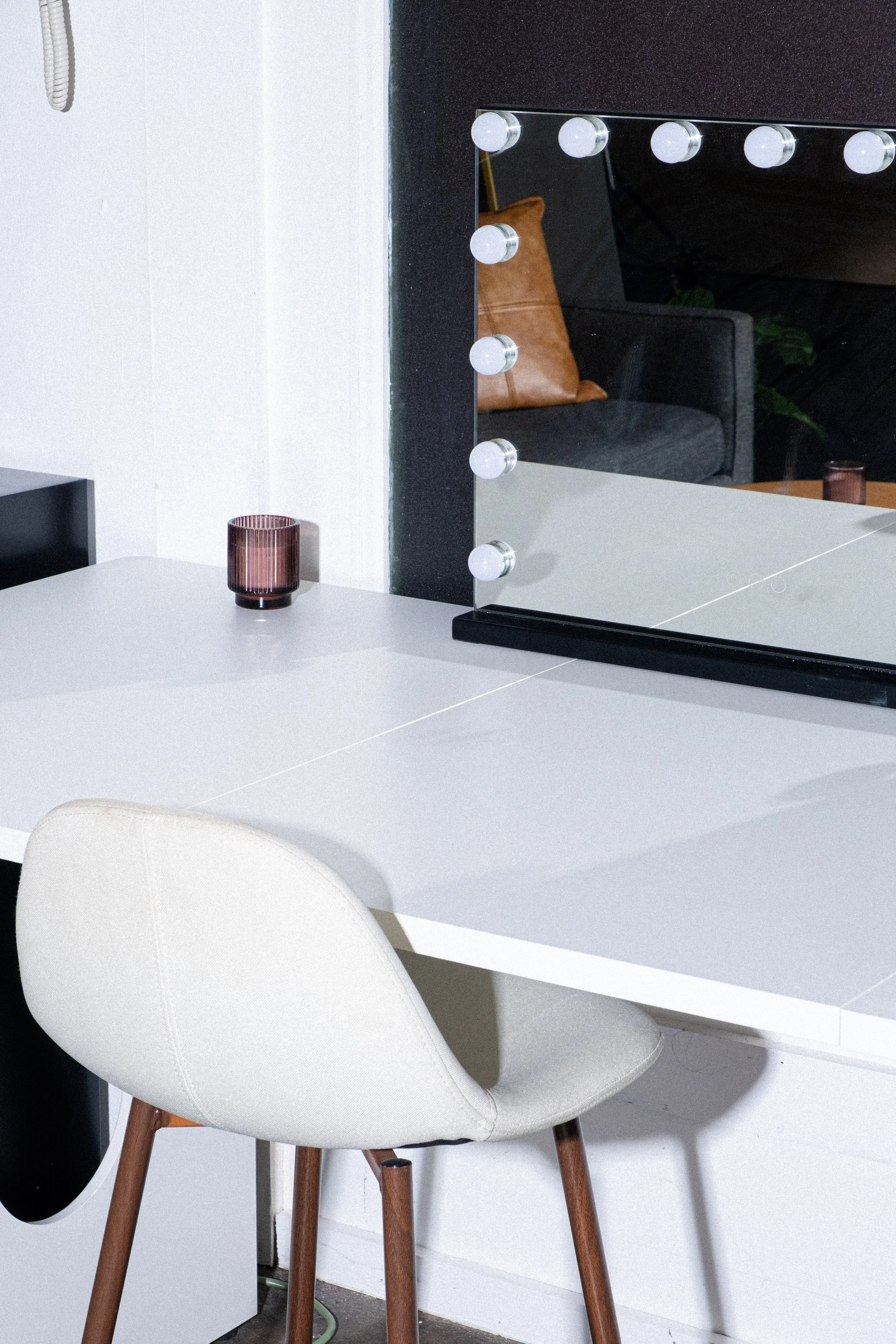 Makeup table with mirror and vanity lighting