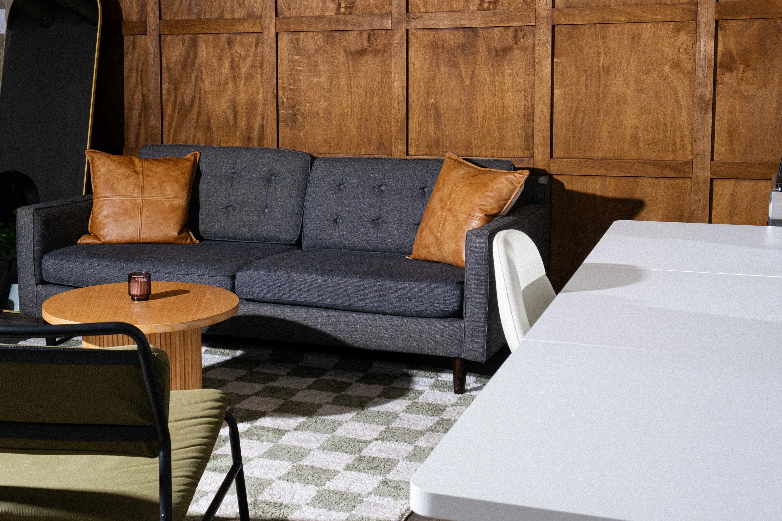 Access to a clean, industrial-style space with black and white feature walls, high ceilings, and cozy design details — perfect for creatives of all levels.